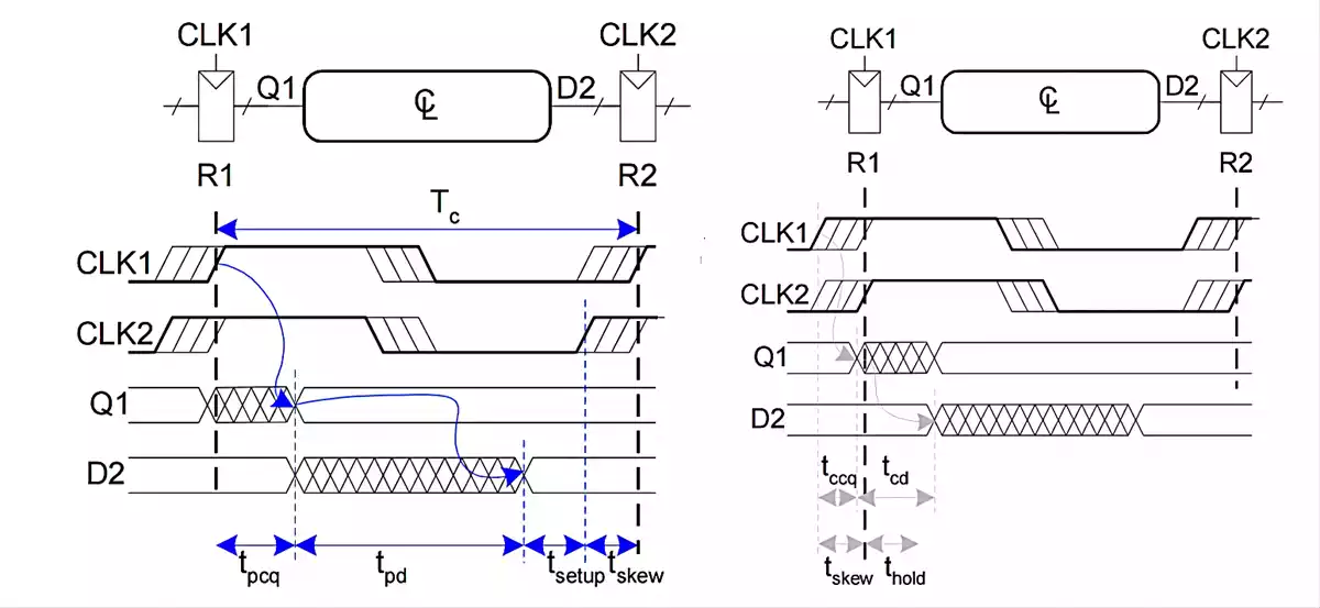 考虑时钟抖动时,要考虑 “最差的情况”。分析过程与 时钟偏移(Clock Skew) 相似。