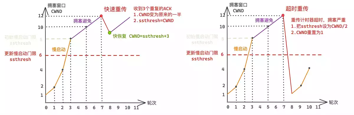 CWND=ssthresh+3);- 超时重传:拥塞比较严重,直接将 ssthresh 设置为原来的一半,窗口重置为 1,再进入慢启动阶段;