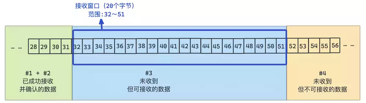 接收端的窗口分为已经接收并确认的区域、未收到但是可以接收的区域(接收窗口),剩下的是不可接收的区域。