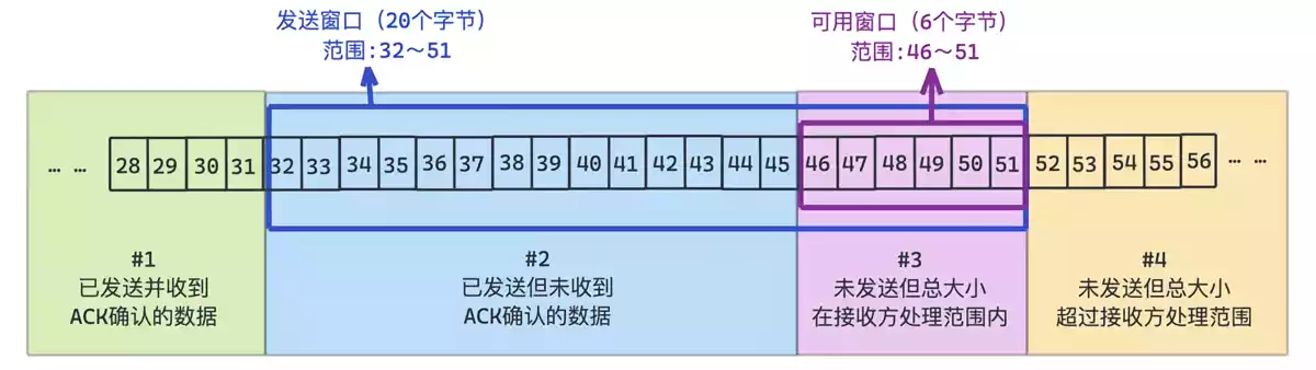 ACK; - 可用窗口:还没有发送,但是还在接收方窗口处理范围内(第二、三部分为整个 发送窗口);