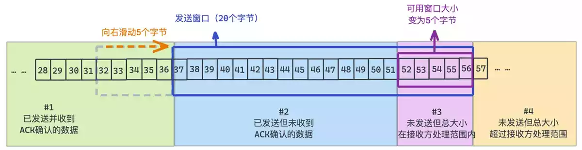 随着 ACK 或进程读取数据,窗口会顺次后移。如果接收到 ACK,表示之前的数据都收到了,那么可用窗口就会顺次右移