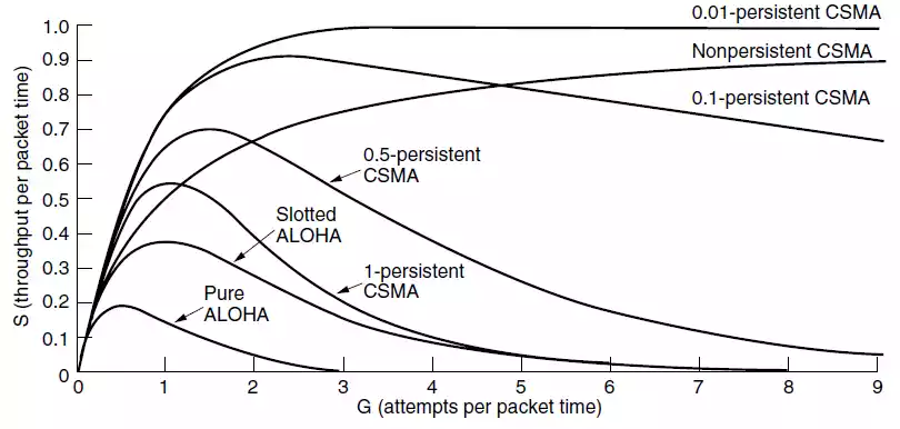 Pure Aloha:如果某个主体想发送一个帧,直接发送;如果产生冲突,冲突帧无效,之后重传;