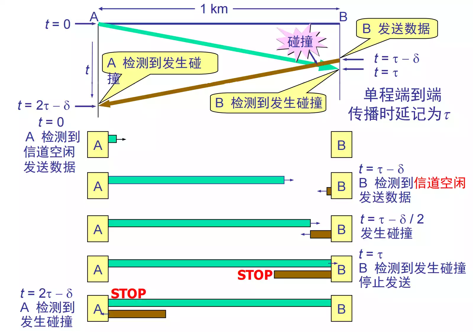 - 传播延迟:结点 A 开始发送数据时,结点 B 也正好有数据要发送,但这时结点 A 发出数据的信号还未到达结点 B,结点 B 侦听到信道空闲,于是立即发送数据,结果必然导致冲突。
