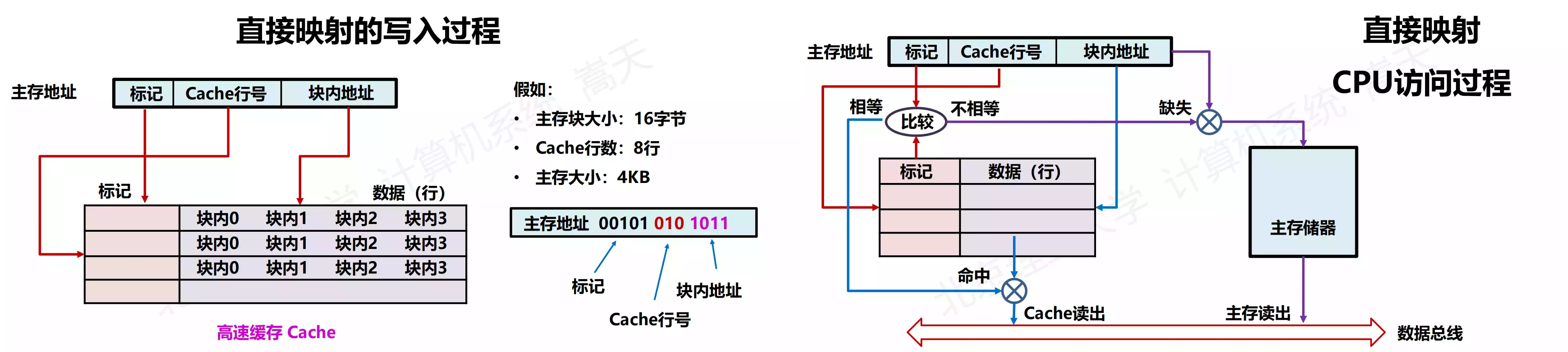 Cache Line 与主存地址的映射。由于 Cache 全硬件执行,CPU 不可见,即不存在 Cache 地址
