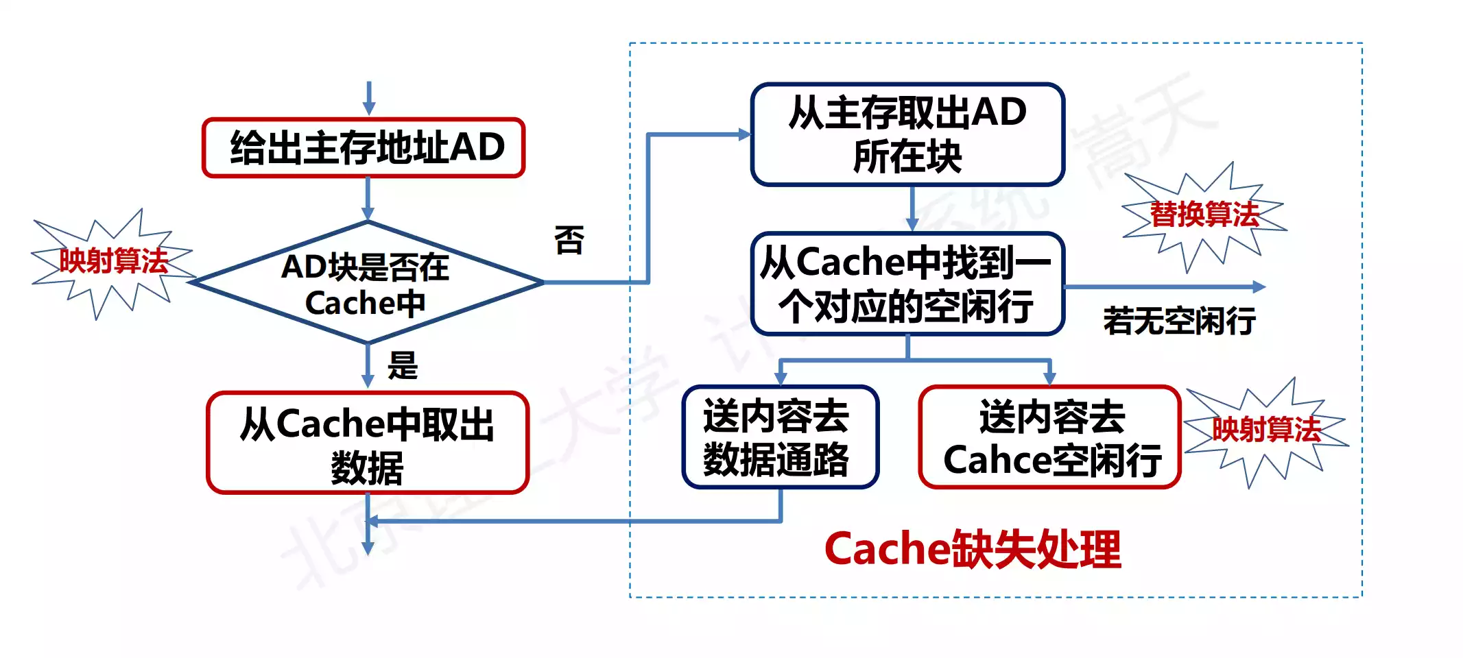 • 行(Line):Cache 中存放一个数据的大小,标记包含一个有效位,表示行内数据是否有效,上电时所有行均无效