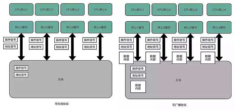 相对于 写失效 协议,还有 写广播 协议,即一个写入请求广播到所有的 CPU 核心,同时更新到各个核心的 Cache,这需要更大的带宽(写失效只需要告知失效的缓存,写广播还需要传输对应的数据)